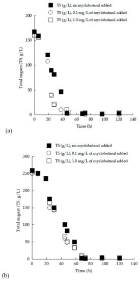 Enriched grape must employed as a substrate contained almost equivalent initial concentrations of glucose and fructose, while in the trials performed with TS0 adjusted to approximately 250 g/L, excessively high substrate concentrations were indeed employed (“very-high-gravity fermentation” conditions; [13]). It is well known that S. cerevisiae strains can ferment carbon sources like glucose and fructose even in the presence of oxygen, and, in several cases, indeed very high quantities of sugars have been assimilated by the employed strains in batch and/or fed-batch strategies [5,8,12,46,60]. The two newly isolated LMBF-Y 16 and LMBF-Y 18 strains were used in successive batch fermentations with grape must as the fermentation medium, and both yeast strains completed the fermentation rapidly as the final sugar concentration (TSr) was ≤5.2 g/L (see Table 2 and Table 3). At this concentration value, it is assumed that alcoholic fermentation under actual winemaking conditions has been adequately completed. The kinetics of total assimilated sugars vs. culture time of S. cerevisiae LMBF-Y 18 strain growing on (enriched) grape musts supplemented with 0.0, 0.1, and 1.0 mg/L of myclobutanil (Figure 6), were characterized by almost equivalent profiles, providing evidence that the addition of the biocide did not alter the sugar consumption rate of the employed strain under the present culture conditions.