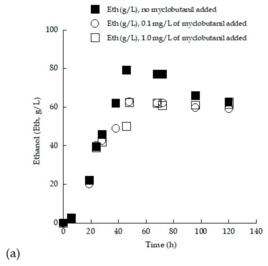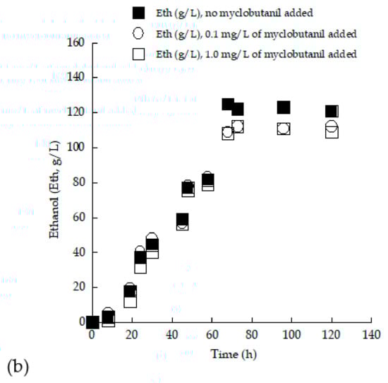 The alcoholic fermentation process is a crucial step in the production of wine [61]. It is known that yeast strains are able to grow exponentially when sugars are available in the fermentation medium, producing ethanol as a perfectly growth-associated product of the process [5]. In the present study, ethanol production of the two novel yeast strains was monitored during fermentation with TS0 concentrations of approximately 150 and 250 g/L. As seen in Table 2 and Table 3, both strains were capable of fermenting sugars and producing ethanol in significant amounts under aerated conditions (Crabtree effect), which can be often observed in yeast genera where the microbial metabolism is shifted toward the synthesis of ethanol in spite of the significant oxygen quantities present in the culture medium [46,60]. As it can be noticed from the kinetic results obtained, the addition of biocide somehow negatively affected the maximum quantity of ethanol achieved for both employed strains. Specifically, for the case of the strain LMBF-Y 18, the addition of myclobutanil noticeably reduced the maximum quantity of ethanol (Ethmax) for both the trials with TS0 adjusted to approximately 150 and 250 g/L (Figure 7). In the former case, the blank experiment resulted in an Ethmax quantity of 79.0 g/L, with the respective product concentration being reduced to 60.1 g/L upon biocide addition. However, in the case of the blank experiment at TS0 ≈ 250 g/L, Ethmax concentration was reduced from approximately 125.0 g/L to 112 g/L with the addition of myclobutanil into the medium. The kinetics of ethanol synthesized vs. the culture time for the strain S. cerevisiae LMBF-Y 18 growing on (enriched) grape musts supplemented with 0.0 (control experiment), 0.1, and 1.0 mg/L of myclobutanil can be seen in Figure 7, demonstrating the negative effect of the addition of the biocide upon the production of ethanol.
