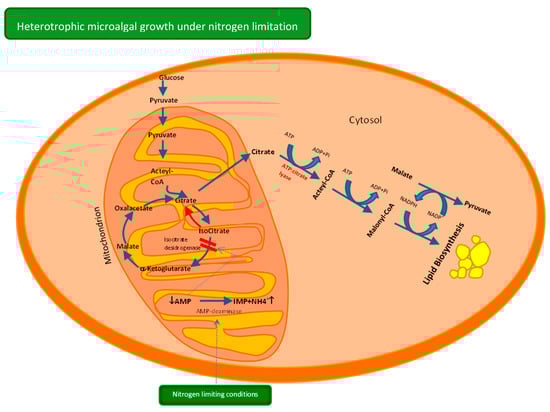 In heterotrophic metabolism, the organic carbon uptaken by microalgae is broken down in the same way as bacteria is. Organic carbon is consumed by heterotrophic microalgae for energy production. Complex molecules like starch can be metabolized via Embden-Mayerhoff-Parnas Pathway (EMP pathway or glycolysis) or the Pentose Phosphate pathway (PPP), generating NADH and ATP [14]. In the first pathway, starch is firstly broken down to glucose which is eventually phosphorylated and directed to the EMP pathway. The final product of this pathway, pyruvate, is formed in the cytosol, and results from the glyceraldehyde-3-phosphate conversion, previously exported into the cytosol. Generally, oleaginous organisms are AMP-dependent of isocitrate dehydrogenase, an enzyme of the TCA cycle which catalyses the isocitrate oxidative decarboxylation. Under nitrogen limiting conditions, the adenosine monophosphate (AMP) deaminase is converted into inosine monophosphate (IMP) and ammonia which is supplied to the nitrogen-starved cells causing the depletion of AMP levels. The isocitrate metabolism is blocked resulting in its accumulation and equilibrium with citrate, in the mitochondrion (Figure 1). The citrate excess is transported out of the mitochondrion to the cytosol. ATP:citrate lyase, a key enzyme in the oleagenicity, will cleave citrate in the cytosol, resulting in acetyl-CoA synthesis for fatty acids production [15]. This pathway almost ends in the palmitic (16:0) or stearic (18:0) acids synthesis. For long-chain fatty acids synthesis, including PUFAs synthesis, subsequent elongation and desaturation series involving elongases and desaturases are required. Only fungi and algae have the capacity to synthesize lipids containing more than 20% PUFAs (w/w total fatty acids), which make them attractive for this goal [15].