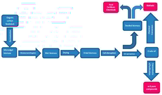 In the biorefinery concept, still rarely applied to heterotrophic microalgal biomass (see Section 9), ω-3 fatty acids can be separated from the remaining microalgal lipids, which can be used for bioenergy or biodiesel production. For example, due to their high oil productivity, Thraustochytrids have the potential for co-production of both ω-3 PUFAs rich oils, as well as shorter chain fatty acids which are less unsaturated, therefore suitable for biodiesel [55]. Later, Chang et al. [56] isolated an Australian Aurantiochytrium sp. strain, TC 20, for co-producing biodiesel and high-value ω-3 PUFAs. The simple fatty acid profile of this strain, having both saturated fatty acids (45–52% w/w TFAs as 16:0) and ω-3 PUFAs (39–48% w/w TFAs as DHA) as major constituents, make it potentially a very good candidate to co-produce both ω-3 PUFAs and biodiesel. The authors did not separate these lipidic fractions, but suggested a further winterization step for separation of ω-3 PUFAs fraction from the remaining fatty acids fraction that could be used for biodiesel purposes. This procedure has been used to valorize fish canning industry byproducts, producing ω-3 compounds and biodiesel [2].