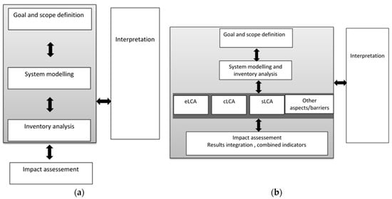 Differences in Environmental life cycle analysis eLCA (a) and Integrated life cycle sustainability assessment (ILCSA) (b) methodologies (adapted from PUFAChain Project [6], and Keller et al., 2015 [61].