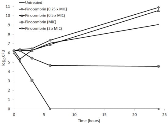 The time-kill kinetics were determined for C. jejuni NCTC 11168 ΔcmeR using the broth microdilution method, with incubation at 42 °C under microaerobic conditions, as described previously []. Sequential plating of serial culture dilutions was carried out on Mueller-Hinton agar, at 0 h, 3 h, 6 h, and 24 h after addition of pinocembrin at 16 µg/mL (0.25 × MIC), 32 µg/mL (0.5 × MIC), 64 µg/mL (MIC), and 128 µg/mL (2 × MIC). The colony forming units (CFUs) were counted after 24 h incubation at 42 °C under microaerobic conditions [].