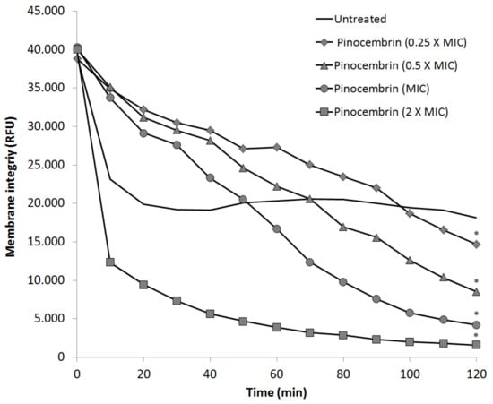 The influence of pinocembrin on the membrane integrity of C. jejuni NCTC 11168 ΔcmeR was investigated at 16 µg/mL (0.25 × MIC) to 128 µg/mL (2 × MIC), using Live/Dead BacLight Bacterial Viability kits (L-7012; Molecular Probes, Eugene, OR, USA), as reported previously []. Two individual experiments were carried out in duplicate. Membrane disruption (%) was calculated from the kinetics measurements of the treated relative to the untreated cultures [].