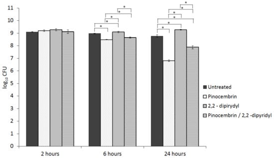 To examine the influence of pinocembrin on hydroxyl radical formation, we tested the viability of the C. jejuni 11168 ΔcmeR cultures under treatment with pinocembrin and 2,2-dipyridyl. 2,2-Dipyridyl is an iron chelator that can reduce harmful hydroxyl radicals generated in the Fenton reaction []. We found a significant influence of 2,2-dipyridyl on the pinocembrin action, especially after 24 h of treatment. The viabilities of the C. jejuni cultures treated with the combination of pinocembrin at the inhibitory concentration of 64 µg/mL plus 2,2-dipyridyl were significantly (p < 0.05) higher compared to those treated with the pinocembrin alone. Pinocembrin decreased C. jejuni NCTC 11168ΔcmeR viability by 2 log units after 24 h, which was decreased to 1 log unit with the addition of 2,2-dipyridyl. Treatment with 2,2-dipyridyl alone increased the viability by 0.5 log unit compared to the untreated C. jejuni cultures (Figure 3).