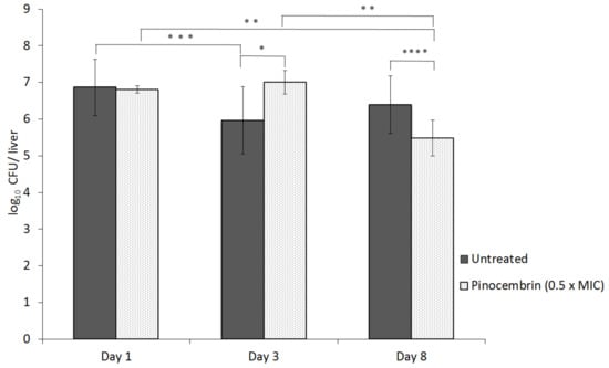 The influence of the sub-inhibitory pinocembrin concentration (32 µg/mL; 0.5 × MIC) on C. jejuni virulence was tested in a murine model. Four groups of BALB/c mice were intravenously infected with C. jejuni NCTC 11168 wild-type and the C. jejuni NCTC 11168 ΔcmeR mutant, as either untreated or pre-treated with the sub-inhibitory concentration of pinocembrin. After an initial and significant rise in the number of C. jejuni isolated for the third day post-infection, at eight days post-infection, the number of C. jejuni recovered from the mice livers in the pinocembrin-treated group diminished significantly in comparison to the untreated control (Figure 4).