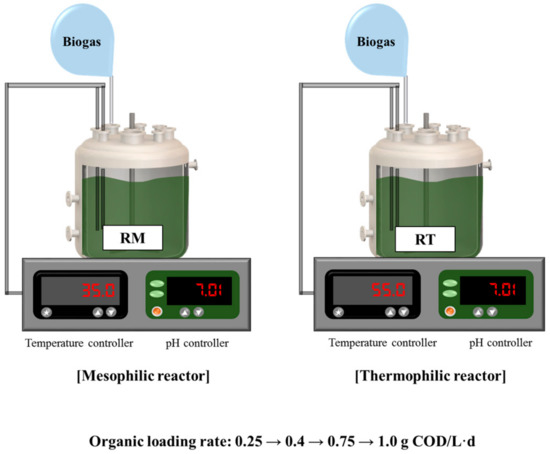 Two anaerobic reactors with a working volume of 2 L, named RM and RT, were operated in sequencing batch mode at mesophilic (35 ± 2 °C) and thermophilic (55 ± 2 °C) temperatures, respectively (Figure 1). The reactors were initially filled with inoculum (100%, v/v) and purged with N2 for 20 min to remove residual oxygen before feeding. Both reactors were maintained at neutral pH by adding 3 N NaOH solution during operation. One sequencing batch cycle consisted of four stages in sequence: filling (<10 min), reacting (21 h), settling (3 h), and drawing (<10 min). The reactors were tested with increasing OLR (0.25, 0.4, 0.75, and 1.0 g COD/L·d) by increasing the substrate concentration at a constant hydraulic retention time of 20 days. Steady-state performance data at each OLR were obtained after at least three turnovers of the reactor working volume.