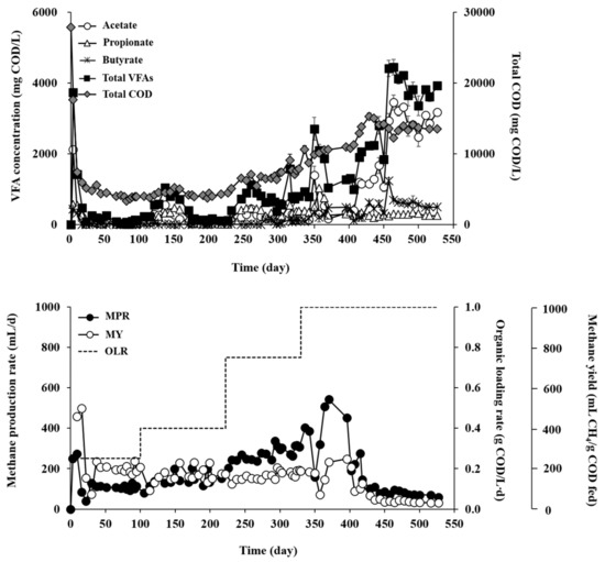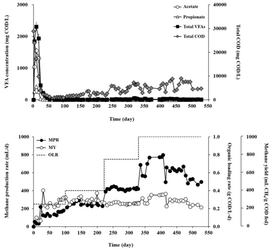 RM and RT showed very different AD performances during the experiment for over 500 days at increasing OLRs (Figure 2 and Figure 3). RM maintained significantly better and more stable performance, in terms of organic removal, residual VFAs, and methane production, than RT at all tested OLRs (Table 1). The COD removal efficiency ranged from 56.6% to 81.9% across the experimental phases with different OLRs in RM, while it ranged only from 21.2% to 49.9% in RM. The observation of the lowest COD removal efficiency at an OLR of 0.25 g COD/L·d in RT may be attributed to temperature stress on the inoculum microorganisms collected from a mesophilic digester [23]. Microorganisms that are not thermotolerant may have been damaged in RT by exposure to thermophilic temperature, which can result in cell death and release of cell debris and thus adversely affect the treatment performance and effluent quality. In support of this, the effluent concentration of volatile suspended solids (VSS) was 2.1-fold higher in RT than in RM effluent at OLR of 0.25 g COD/L·d (data not shown), presumably owing to the discharge of inactive or dead microorganisms and cell debris with the decanted supernatant [24]. Although the COD removal efficiency of RT increased somewhat, as microorganisms gradually acclimated to the reactor temperature, with increasing OLR, it still remained in much lower ranges than those of RM.