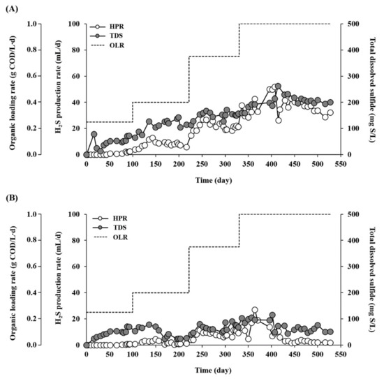 Sulfidogenesis was also much more active in RM than in RT throughout the experiment (Figure 4). A measurable content of H2S was first detected in the biogas after three turnovers of the working volume in RT, whereas it was detected after only one turnover in RM. The H2S production rate (HPR) and effluent TDS concentration in RM increased from 1.17 to 15.78 mL/L·d and from 65.7 to 201.1 mg S/L, respectively, with increasing OLR from 0.25 to 1.0 g COD/L·d (Table 1). Correspondingly, the H2S yield (HY, per substrate COD fed) of RM also increased from 4 to 14 mL H2S/g COD fed with the increase in OLR. Although significantly lower than that of RM, the HPR of RT gradually increased up to 5.31 mL/L·d with increasing OLR until 0.75 g COD/L·d. However, as observed for methanogenic performance, it dropped suddenly to 1.0 mL/L·d with a further increase in OLR to 1.0 g COD/L·d. Compared to RM, RT showed much lower HY (0.9–6.5 mL H2S/g COD fed) and TDS concentration (25.3–73.7 mg S/L) in the tested OLR range.