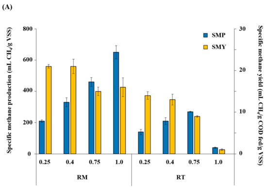 The methane content in biogas decreased with increasing OLR in both reactors (Table 1), meaning that methanogenesis was diminished by increased organic load. Similar observations of methane content reduction with increasing OLR, particularly under overloading conditions, have been reported in previous studies [35,36]. It is notable that the decrease in methane content was far more significant in RT than in RM, particularly at an OLR of 1.0 g COD/L·d. Such differences in methane content and in its variations with increasing OLR can be attributed to the different methanogenic activities of the RM and RT microbial communities. It is also worth noting that the methane content is affected by the changes in gas solubility in water according to temperature (mole fraction in liquid phase): 4.8 × 10−4 at 35 °C and 3.4 × 10−4 at 55 °C for CO2 and 2.2 × 10−5 at 35 °C and 1.8 × 10−5 at 55 °C for CH4 [37].