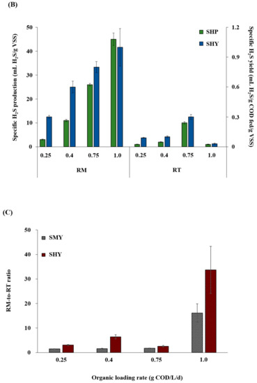 Changes in specific methane production (SMP) and yield SMY; (A) and specific H2S production (SHP) and yield SHY; (B) with increasing organic loading rate (OLR) in RM (mesophilic) and RT (thermophilic), and the ratios of SMY and SHY in RM to those in RT (RM-to-RT ratio) at each OLR (C). Samples are labeled with the corresponding reactor names and OLRs (days).