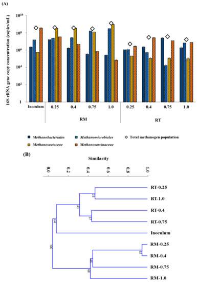 Changes in methanogenic 16S rRNA gene concentrations with increasing OLR in the experimental reactors (A) and cluster dendrogram generated based on the relative abundances of target methanogenic groups (B). Samples are labeled with the corresponding reactor names (RM, mesophilic; RT, thermophilic) and OLRs (days).