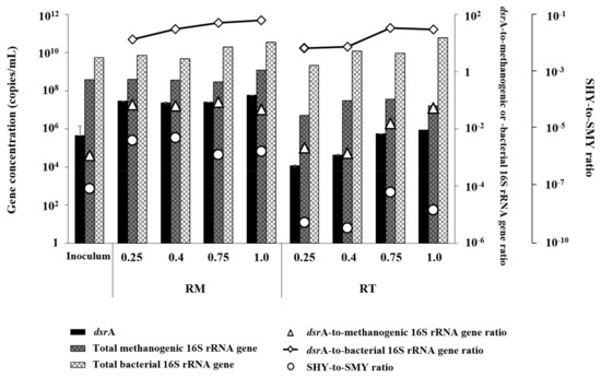 Interestingly, the SHY-to-SMY ratio tended to rise with increasing OLR in both reactors, although it remained lower in RT than in RM throughout the experiment. This result indicates that an increasing proportion of electrons flowed to H2S (i.e., changes in metabolic properties of microbial community) at higher OLRs in both reactors. It appears that the activity of SRBs was promoted by increased organic load under both temperature conditions. It is worth noting that the abundance of SRBs relative to total methanogens (i.e., the dsrA-to-methanogenic 16S rRNA gene ratio) and the abundance of SRBs to total bacteria (i.e., the dsrA-to-bacterial 16S rRNA gene ratio) were both consistently lower in RT than in RM during the experiment. This result further supports that sulfidogenic activity was more significantly suppressed relative to methanogenic activity under the thermophilic conditions in RT, although both were adversely affected under thermophilic conditions. Therefore, thermophilic operation may provide a way to effectively suppress sulfidogenesis, with relatively less effect on methanogenesis.