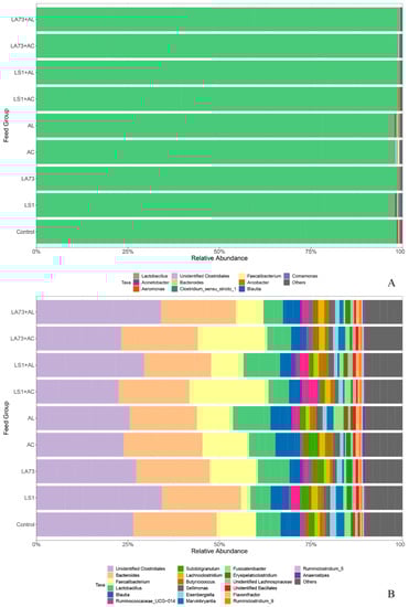 Phylogenetic composition of the intestinal microbiota in young broiler chickens. (A) Genus distribution in the crop; (B) Genus distribution in the caecum (LS1: L.salivarius, LA73: L. agilis, AC: formulation C, AL: formulation L). Data of each group are presented as the mean of five samples.