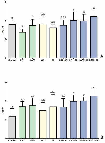 In crop samples, the significantly lowest lag time, and thus, the best fitness of the E. coli strain was observed in the LS1 treatment group, followed by the formulation L (Figure 2A). However, the combination of both additives slightly increased lag time compared to a single application. The significantly lowest fitness was noted in the combination of LA73 and formulation L, although their single application yielded a significantly higher fitness.