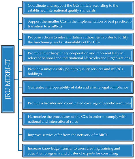 The mission of MIRRI-IT is to overcome fragmentation in availability of resources and services offered by the Italian system of mBRCs and CCs, while enhancing the quality management system of the collections, focusing on the needs and challenges of the stakeholders interested in the biotechnological transfer of these resources. The main activities of MIRRI-IT are indicated in Scheme 1.