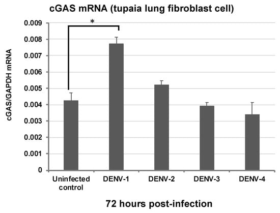 Dengue is the most prevalent and rapidly spreading mosquito-borne viral disease, rendering 3.9 billion people at risk of DENV infection worldwide, with around 390 million DENV infections occurring each year []. There are four different but closely related DENV serotypes: DENV-1, DENV-2, DENV-3, and DENV-4. Their infections result in a wide range of clinical manifestations ranging from self-limiting Dengue fever to life-threatening Dengue hemorrhagic fever and Dengue shock syndrome []. Currently, licensed vaccines for common use or antivirals are lacking, impeding the prevention and control of DENV infection. Progress towards understanding DENV pathogenesis and immune response is hampered by the lack of a suitable animal model, which can reflect Dengue diseases in humans []. Animal models, including mice, rhesus monkeys, chimpanzees, and marmosets, have been utilized in studying DENV infection but their ability to recapitulate the human disease remains challenging []. Therefore, searching for alternative suitable small animal models for DENV infection study is imperative. To this end, we have investigated the susceptibility of Tupaia cells to infection by wild type DENV serotypes 1–4 []. All the serotypes could establish infection in Tupaia cells and viral copy numbers increased linearly after the onset of infection, with DENV serotype 2 showing the highest replication efficiency in the cells []. As the role of toll-like receptors (TLRs) on innate immune recognition against DENV infection was not well characterized, we used Tupaia cells to characterize the role of TLRs in DENV infection; an increase of TLR8 messenger RNA (mRNA) levels was found in all DENV infections. Knockdown of TLR8 expression led to a significant increase in DENV-1 viral load, both in Tupaia cells and their corresponding culture supernatants, indicating a suppressive role of Tupaia TLR8 in DENV replication in vitro []. In addition, we also observed modulation of cytokines/chemokines in DENV-infected Tupaia cells, suggesting the involvement of these innate immune components in DENV infection, similar to that observed in human infections [,,]. A recent study [] demonstrated that DENV could activate a cGAS response and in an in vitro study of DENV infection we detected the expression pattern of cGAS in the sample from a previous study [], as described []. We observed that DENV serotype 1, but not other serotypes, significantly upregulated cGAS mRNA expression 72 h post-infection in Tupaia cells (Figure 1). This may suggest different features of DENV serotype 1 compared to the other serotypes.