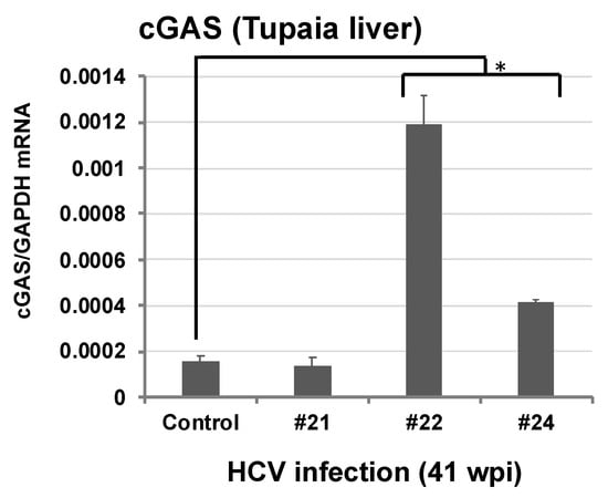 Intrahepatic Tupaia cGAS response to HCV infection 41 weeks post-infection. Changes in the expression levels of cGAS mRNAs in HCV1a- (#21), HCV1b- (#22), and HCV2a- (#24) infected Tupaia liver tissues measured by one-step qRT-PCR []. Gene expression levels were normalized against the expression level of GAPDH mRNA. Asterisk indicates significant differences calculated by the Student’s t-test (* p < 0.05). Where not indicated, differences were not significant (p > 0.05). Data are presented as mean ± SD (n = 3).