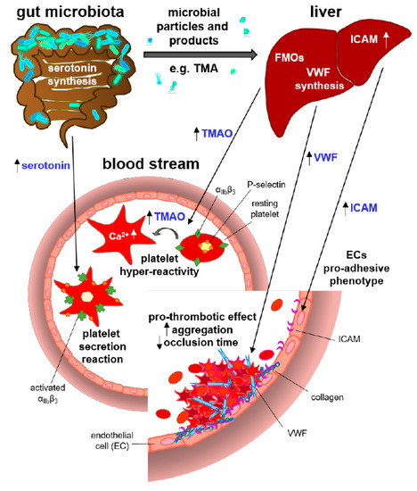 Evidence for a pro-thrombotic role of the gut microbiota as identified by gnotobiotic mouse models. Serotonin from enterochromaffin cells in the intestinal epithelial lining and the microbiota-derived choline-metabolite trimethylamine N-oxide (TMAO) were described to promote platelet reactivity, following agonist-induced platelet activation [82,88]. The gut microbiota increases the expression of endothelial adhesion molecules, such as ICAM-1 and VWF [95,96].