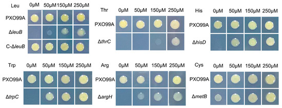 Growth of Xoo amino acid auxotrophic strains. Bacterial cultures were spotted and cultured for three days at 28 °C on M4N agar plates that were supplemented with 0, 50, 150, and 250 µM amino acids as indicated in the figures. PXO99A, wild-type Xoo strain; ΔleuB, leuB deletion mutant; ΔthrC, thrC deletion mutant; ΔhisD, hisD deletion mutant; ΔtrpC, trpC deletion mutant; ΔargH, argH deletion mutant; and ΔmetB, metB deletion mutant. Three replicates for each treatment were performed; the experiments were repeated three times.