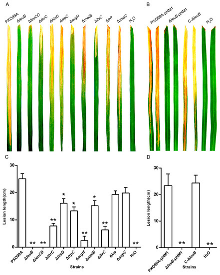 Virulence of Xoo strains on rice leaves. Water-soaked lesions displayed on IR24 60-day-old rice leaves with the indicated Xoo strains by clipping methods are shown in (A,B). The lesion length of the infected leaves is shown in (C,D). Virulence assays were performed on 20 leaves, and the means ± standard deviation were calculated at 14 days post-inoculation. PXO99A, wild-type Xoo strain; ΔleuB, leuB deletion mutant; ΔleuCD, leuCD deletion mutant; ΔthrC, thrC deletion mutant; ΔhisD, hisD deletion mutant; ΔtrpC, trpC deletion mutant; ΔargH, argH deletion mutant; ΔmetB, metB deletion mutant; ΔilvC, ilvC deletion mutant; Δlrp, lrp deletion mutant; ΔaspC, aspC deletion mutant; PXO99A-pHM1, PXO99A containing an empty vector pHM1; ΔleuB-pHM1, ΔleuB containing an empty vector pHM1; and C-ΔleuB, the ΔleuB complemented strain. The experiments were repeated three times. *: differences between the mutant and PXO99A (p < 0.05); **: significant differences between the mutant and PXO99A (p < 0.01).