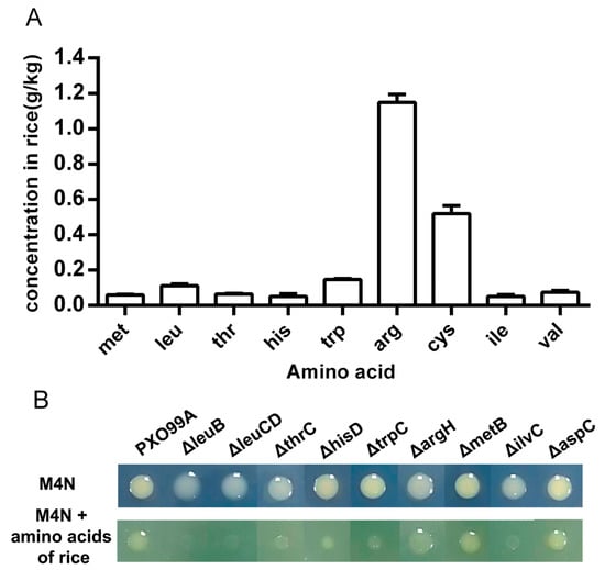 The reduced virulence of the amino acid auxotrophic strains indicates that rice leaves cannot provide a sufficient amount of the corresponding amino acids. To confirm this finding, we first measured the concentration of various amino acids in rice leaves (Figure 3A). Except for increased arginine (~1.1 g/kg) and cysteine (~0.5 g/kg) contents, the contents of the remaining amino acid in rice leaves were less than 0.2 g/kg, and methionine, threonine, histidine, isoleucine, and valine were even lower than 0.1 g/kg. Then, we detected the growth states of the Xoo strains in M4N media supplemented with raw extracts of amino acids from rice leaves. Wild-type PXO99A and the deletion mutants grew well in M4N media supplemented with 250 µM amino acids. Significant growth inhibition was observed in ΔleuB, ΔleuCD, ΔthrC, ΔhisD, ΔtrpC, and ΔilvC when the raw extracts of amino acids from rice leaves were used as the sole nitrogen source (Figure 3B). This result may be due to the low concentrations of leucine, threonine, histidine, tryptophan, isoleucine, and valine in rice and/or the insufficient transportation of these nutrients by these mutants. Therefore, our results illustrate that limiting amino acid availability in rice leaves may restrict Xoo growth in planta.