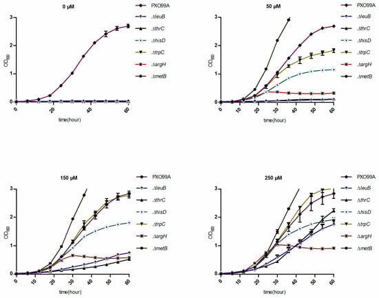 As the virulence phenotypes of some amino acid auxotrophic strains are not explained by the content of amino acids in rice leaves, we hypothesize that Xoo cannot efficiently utilize these amino acids. Thus, we tested how much amino acids in the environment could afford the growth of these Xoo strains. The growth rates of PXO99A and the mutants (ΔthrC, ΔhisD, ΔtrpC, ΔargH, and ΔmetB) in M4N supplemented with different concentrations of leucine, threonine, histidine, tryptophan, arginine, and cysteine are shown in Figure 4. Almost all the bacteria grew faster as the concentration of amino acids increased. Notably, ΔleuB and ΔthrC did not grow well in the presence of 50 µM leucine and threonine, respectively. Moreover, these mutants also grew slower than the wild-type strain even in the presence of 250 µM of the corresponding amino acids. These results suggest that the reduced growth rates of these auxotrophy strains, even at high amino acid concentrations, may be the reason that these strains had a worse inflectional ability compared with that of the wild-type strain.