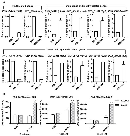 Leucine regulates the expression of genes involved in the biosynthesis of other amino acids and virulence-related genes. (A) The relative expression levels of genes involved in chemotaxis, type VI secretion, and amino acid synthesis in ΔleuB in M4N medium supplemented with 250 µM leucine or not. (B) β-Glucuronidase (GUS) analysis of the activities of chemotaxis- and amino acid synthesis-related gene promoters in ΔleuB and PXO99A. The experiments were repeated three times. The data are the means ± standard deviations from three repeats. *: differences between the mutant and PXO99A (p < 0.05); **: significant differences between the mutant and PXO99A (p < 0.01).