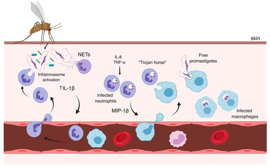 - Peters, N.C.; Egen, J.G.; Secundino, N.; Debrabant, A.; Kimblin, N.; Kamhawi, S.; Lawyer, P.; Fay, M.P.; Germain, R.N.; Sacks, D. In vivo imaging reveals an essential role for neutrophils in leishmaniasis transmitted by sand flies. Science 2008, 321, 970. [Google Scholar] [CrossRef]