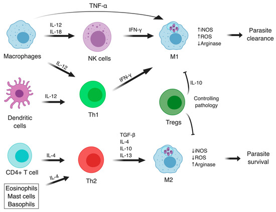 Macrophage polarization. Distinct stimuli induce the M1 or M2-like phenotypes in infected macrophages, which depend on CD4+ T cell differentiation in Th1, Th2, Tregs, among other subsets not shown here. Infected macrophages and dendritic cells (DCs) produce proinflammatory cytokines, such as IL-12, which induce Th1 differentiation. Th1 and Natural Killer (NK) cells, in turn, release interferon (IFN)-γ, stimulating iNOS expression and activity in infected cells, which promote parasite killing. On the other hand, Th2 differentiation leads to production of anti-inflammatory cytokines, which downregulate iNOS activity and stimulates arginase, culminating in parasite survival and proliferation. Tregs promote the balance of pro- and anti-inflammatory responses, avoiding tissue destruction, and controlling pathology (adapted from Maspi et al. [60]). Image created with BioRender.com.