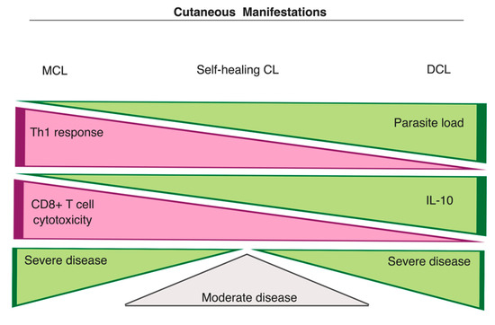 Main features of cutaneous manifestations. This spectrum shows the characteristics of immune responses in MCL (severe disease), CL (moderate disease), and DCL (severe disease). MCL patients develop an exacerbated Th1 response and present high numbers of CD8+ T cells, which promote disease severity. On the other side, DCL is characterized by high parasite loads in lesions, diminished levels of Th1 cytokines, and increased production of IL-10 (adapted from Scott and Novais [11]). Image created with BioRender.com.