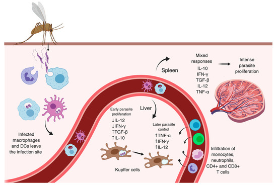Overview of mechanisms leading to parasite dissemination and proliferation in visceral leishmaniasis. Parasites inoculated into the dermis are captured by innate immune cells. It has been proposed that infected macrophages and dendritic cells (DCs) may leave the infection site and migrate to other areas, disseminating parasites to internal organs, such as liver and spleen. In the liver, early parasite proliferation in Kupffer cells is associated with decreased levels of IL-12 and IFN-γ and up-regulation of anti-inflammatory cytokines. Later, with infiltration of monocytes, neutrophils, CD4+, and CD8+ T cells in liver granulomas, increased levels of proinflammatory cytokines are observed, and infected cells are able to eliminate parasites. However, a heterogeneous pro- and anti-inflammatory responses in the spleen seems to affect the interaction of antigen-presenting cells with T cells and induce intense proliferation of parasites in this lymphoid organ. Image created with BioRender.com.