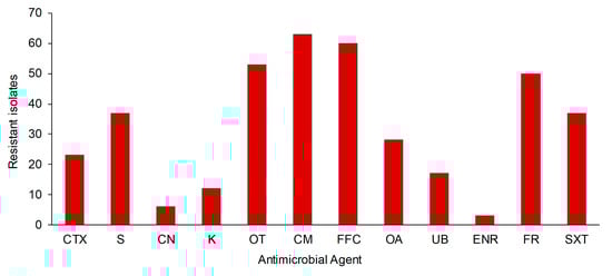 The susceptibility of isolates to various antimicrobials was determined by a disk diffusion test according to the CLSI []. Briefly, the bacterial isolates were resuspended in phosphate buffered saline (PBS) to obtain a turbidity corresponding to 0.5 McFarland standard (bioMerieux, Marcy-l’Etoile, France). Bacterial suspensions were seeded in plates containing Mueller-Hinton agar (MH, Difco Labs, NJ, USA) and the suspension excess was discarded using a micropipette, and disks (Oxoid, Basingstoke, Hampshire, England) containing the following antibiotics were used: cefotaxime (CTX, 30 μg), streptomycin (S, 10 μg), gentamicin (CN, 10 μg), kanamycin (K, 30 μg), oxytetracycline (OT, 30 μg), chloramphenicol (CM, 30 μg), florfenicol (FFC, 30 μg), oxolinic acid (OA, 2 μg), flumequine (UB, 30 μg), enrofloxacin (ENR, 5 μg), furazolidone (FR, 100 μg), and sulfamethoxazole trimethoprim (SXT, 25 μg). Plates were incubated at 22 °C for 24 h according to CLSI guidelines [], and isolates were considered resistant according to the criteria established by the CLSI [,] or by Miranda and Rojas []. Escherichia coli ATCC 25922 was used as a quality control strain, as recommended by the CLSI []. A number of isolates (30%) were re-examined to check the reproducibility of the assay.