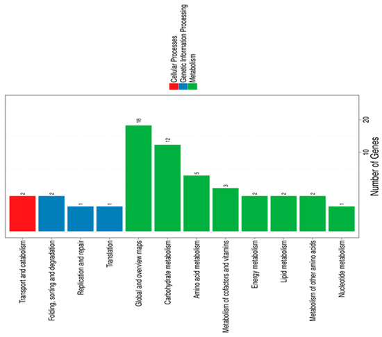 We used an RNA-seq approach to examine the physiological and metabolic status of the B. breve DSM 20213 strain following in vitro exposure to 0.5 g/L of LA. Gene expression was compared between the intestinal bacterium grown in MRS-cys-LA compared to in MRS-cys, to identify genes that were differentially expressed between the two conditions. Gene ontology (GO) classification and functional enrichment were performed, revealing that the differentially expressed genes could be classified into three ontology clusters: molecular biological function, cellular components, and biological process (Figures S1 and S2).