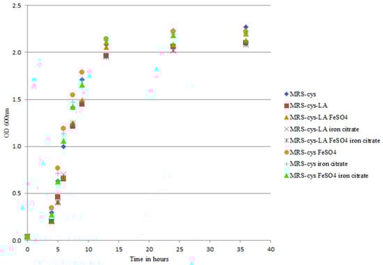 The overnight culture of B. breve DSM 20213 was used to inoculate 50 mL of MRS-cys (1% v/v) supplemented with 50 mM ferric citrate, 50 mM iron sulfur, or a combination of both (1:1), to investigate the role of iron in LA metabolization. Samples were prepared with and without the addition of 0.5 g/L LA. The strain grown in MRS-cys was used as the control. A spectrophotometer was used to measure the OD600 hourly up to 15 h, and every 10 h thereafter.