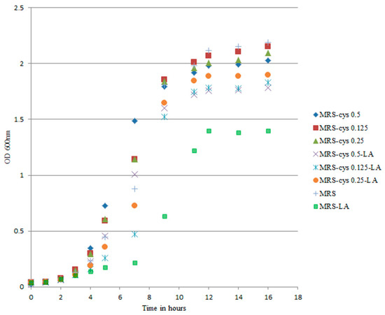 Cysteine is associated with a protective effect against oxygen during anaerobic bifidobacteria growth [33]. To explore the actual impact of cysteine on the oxidative status of B. breve under our experimental conditions, we reduced the cysteine concentration in the medium down to 0 g/L while maintaining an LA concentration of 0.5 g/L. The decreased cysteine content modified the trend of the growth curves, particularly in MRS-LA (Figure 3).