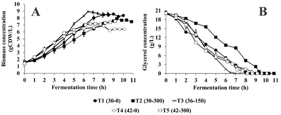 The initial glycerol concentration was 20 g/L for all batch cultures in the experimental design (Figure 1B). The maximum YX/S (0.37 g/g) was obtained in the central point of the experimental design (T36-150), carried out at 36 °C with kanamycin concentration of 150 mg/L. This result was to be expected since 36 °C is within the optimum temperature growth range for E. coli. It is similar to the ones described previously [37].