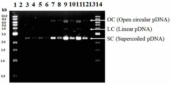 The densitometric analysis is presented in Figure 2. The % sc-pDNA were above 90% in all the treatments evaluated in this work which is a requirement to develop DNA vaccines [41,42]. The Federal Drug Administration (FDA) recommends that plasmid DNA vaccines have a content of >80% in the sc-pDNA [43].