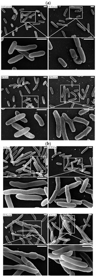 The SEM images by pairs of Escherichia coli DH5α samples during experiments carried out in this work. Micrograph above: ×10,000 (▬ 1 µm); below: ×25,000 (▬▬ 1 µm). (a) A-Control: control at t = 0 for all treatments were taken at steady-state phase, B-T(30-0), C-T(30-300), D-T(36-150). (b) E-T(42-0), F-T(42-300), G-T(36-50), H-T(42-50).