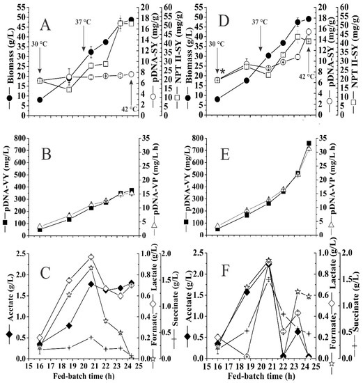 Under this condition, the best values obtained for pDNA yields specific and volumetric were similar to those reported by Jaén et al. [11] using the same heating rate (0.025 °C/min) and glucose as carbon source. In our experiment, the YpDNA/x remained relatively constant when temperature was increased from 30 to 42 °C, during this increase, the organic acid accumulation increased reaching the highest concentration at 37 °C at 20.7 h, but later the value decreased by total consumption of formate and succinate while lactate was partially consumed. Acetate concentration remained almost constant until the end of fed-batch culture, reaching a maximum of 1.8 g/L. This value is low compared to other high-cell-density cultures using DH5α for pDNA production [11,57] but similar to the one obtained with another strain [16,58]. The acetate accumulation, by increasing temperature and higher µ, affected the Yx/s value and only had a minor negative effect on plasmid replication [59]. The high concentration of antibiotic (six times more than commonly used) in HCDC does not have statistically significant effects (p ˃ 0.05) on biomass, reaching 49.10 ± 1.23 gCDW/L (Figure 4D). However, at the end of the fed-batch phase, important differences were obtained in the specific yields of NPTII and mainly of pDNA being 41.06 ± 0.04 mg/gDCW and 15.47 ± 0.65 mg/gDCW, respectively, which represents a decrease of 20% in the NPTII specific yield and a two-fold increase in the pDNA specific yield, compared to fed-batch control. The important increase in the production of pDNA was after 20.7 h, when the culture reached a temperature of 37 °C and having been exposed to the concentration of 300 mg/L of kanamycin for approximately 4.7 h (Figure 4E). This behavior is evident in terms of volumetric productivity and productivity compared to Figure 4B. The maximum values reached for these two parameters were 759.00 ± 12.73 mg/L and 31.19 ± 0.52 mg/L/h, respectively. Synthesis of overflow metabolism products also showed important differences, the main interest product (acetate), increased 26% (2.24 ± 0.04 g/L) in comparison to the fed-batch control. However, it was almost entirety consumed at the end of the fermentation, which was not observed in the control culture as can be seen in Figure 4C,F.