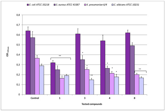 For K. pneumoniae 6/4, compound 1 (MIC 8 µg/mL) determined an OD of 0.163 in comparison to 0.365 of the relative untreated biofilm (p < 0.01), while the treatment with compounds 3 (MIC 128 µg/mL), 4 (MIC 32 µg/mL), and 8 (MIC 128 µg/mL) induced 0.252, 0.214 (p > 0.05), and 0.201 (p < 0.01) OD values, respectively. In the case of C. albicans ATCC 10231, the treatment with compound 1 (MIC 64 µg/mL) reduced the biomass to OD 0.191 in comparison to 0.290 of the control one (p < 0.01); similarly, after exposure to compounds 3 (MIC 128 µg/mL), 4 (MIC 32 µg/mL), and 8 (MIC 128 µg/mL), OD values of 0.148 (p < 0.01), 0.178 (p < 0.05) and 0.168 (p < 0.01), respectively, were registered.