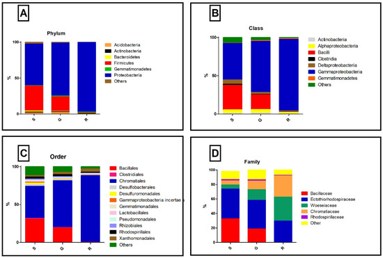 We detected a total of 17 phyla in the samples. Proteobacteria predominated in all samples with 57%, 73%, and 96% in samples S (sediment), G (Gravel-like), and R (rock), respectively, followed by Firmicutes (34%, 20% and 0.6%) and other phyla (Figure 1A). The predominant class in S, G, and R samples were Gammaproteobacteria (47%, 66%, and 93%, respectively), Deltaproteobacteria (5%, 2%, and 1%, respectively), Alphaproteobacteria (4%, 4%, and 2%, respectively) from the phylum Proteobacteria, and Bacilli (32%, 19%, and 0.3%, respectively) from the phylum Firmicutes (Figure 1B). Gammaproteobacterial order, Chromatiales, predominated in all three samples, S, G, and R with 47, 62, and 88%, respectively (Figure 1C), followed by Bacillales (30%, 19%, and 0.18% in samples S, G, and R, respectively). In the family analysis, we identified three families among the Chormotiales order: Ectothiorhodospiraceae, Chromatiaceae, and Woeseiaceae. However, Bacillaceae represented a major part of the microbial community in the S and G samples (Figure 1D). Ectothiorhodospiraceae was the most abundant family found in these samples, while in the rock sample, Chromatiaceae and Woeseiaceae presented a similar representation (Figure 1D).