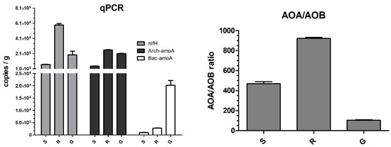 The AOA/AOB ratio showed a dominance of AOA over AOB (Figure 2), at approximately 100-, 500- and 900-times in G, S, and R samples, respectively, indicating a considerable difference among the samples.