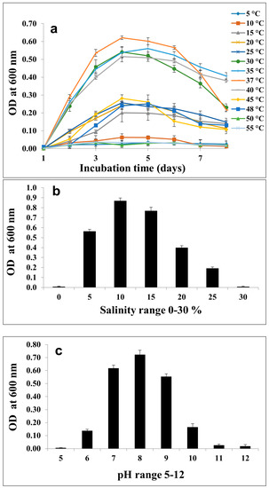 Growth pattern of the strain C12A1. (a) Temperature 5–55 °C. (b) 0–30% NaCl concentration in C modified medium. (c) pH ranges 5–12.