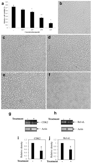 Effect of BEP (Broth extract of Piscibacillus sp.) on MDA-MB-231 cell viability and cell cycle associated genes of breast cancer cell (a) Effect of various concentrations (as shown in graph) of BEP on MDA-MB-231 cell viability. Results are the mean of three independent measurements. Significant differences were determined by one-way ANOVA, * p < 0.05 and **p < 0.01 vs control. (b–f) Images of MDA-MB-231 cells morphology after treatment with increasing concentration (0, 62.5, 125, 250 and 625 µg/mL) of BEP. RT-PCR analysis from the total RNA extracted from BEP treated and untreated cells (g) CDK2 gene and (h) anti-apoptotic Bcl-xL gene. Bars (i,j) showed the densitometry analysis (ratio of concerned gene/Actin) of the bands for CDK2 (i) and Bcl-xL (j). Reported values represent the mean ± SEM of three replicates. * p < 0.05 vs. control. The expression of CDK2 and Bcl-xL was found to be downregulated in the treatment as compared to the control. Actin was considered as the internal loading control. The expression of CDK2 and Bcl-xL were found to be downregulated in the treatment as compared to the control.