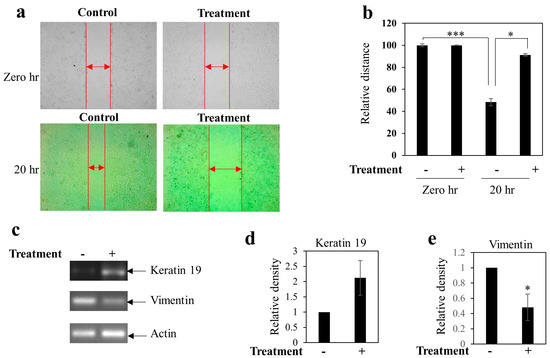 If cancer progresses to the metastatic phase, it will lead to poor outcomes. Cell migration and epithelial to mesenchymal transition (EMT) are crucial steps in the cascade of events leading up to metastatis. Thus, we wanted to know the effect of the BEP on cell migration and EMT of breast cancer MDA-MB-231 cells. We performed a scratch assay to determine the rate of cell migration. The data showed that the BEP extract significantly blocked cell migration (Figure 6a,b). Furthermore, BEP inhibited EMT of breast cancer cells, which was determined by an increased gene expression of the epithelial gene, keratin 19, and decreased gene expression of the mesenchymal gene, vimentin when compared to control (Figure 6c–e).