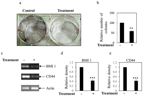 Stemness is accountable for metastasis, drug resistance, and tumor recurrence. To determine the effect of the BEP on stemness property, we performed a colony formation assay, the results of which showed a fewer number of colonies in case of extract treated cells as compared to control (Figure 7a,b). Moreover, RT-PCR analysis showed inhibition of the expressions of cancer stemness-associated BMI1 and CD44 genes, markers of stemness, when cancer cells were treated with BEP as compared to control (Figure 7c–e).