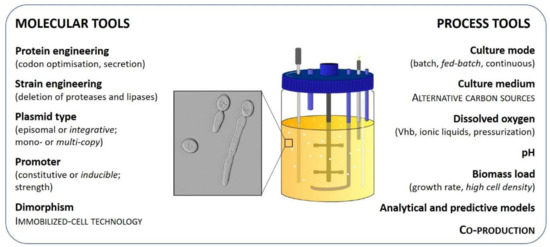 To date, more than 150 recombinant proteins have been produced using Y. lipolytica as a cell factory. However, only 25 of them have been produced at a bioreactor scale. Compared to Pichia pastoris, occurrences of Y. lipolytica-based processes are still scarce at the industrial scale, despite similar yield and productivity ranges. Regardless of reactor-scale recombinant production advances in Y. lipolytica, process efficiency is still hampered by issues such as metabolic load, unmastered dimorphism, and oxygen requirements. Molecular and process strategies (summarized in Figure 1) offer solutions to consequently adjust recipient strains and cultivation conditions, in order to optimize protein quality as well as volumetric yields and productivity [1], the key parameters for bioprocess economic feasibility. The aim of the present review is to provide a comprehensive snapshot of the already available and future molecular and process tools to consider for recombinant protein production in bioreactor using Y. lipolytica as a cell factory, in order to facilitate decision-making for future strain and process engineering.