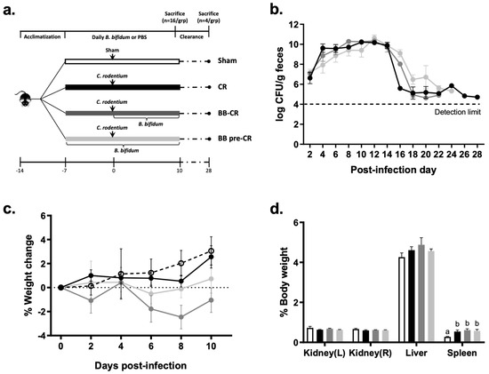 Study design and C. rodentium infection model (a) study design; (b) viable C. rodentium counts in infected mice feces were quantified every other day p.i., n = 9–13/group (day 2–10 p.i.), and n = 1–4/group (day 12–28 p.i.); (c) percentage of body weight change among groups after infection, n = 12/group; (d) percentage of organ weight per gram of body weight among Sham and infected groups on day 10 p.i., n = 8/group. Data are presented as mean ± SE. Statistical significance was determined by repeated-measures ANOVA for C. rodentium counts and weight change and one-way ANOVA for organ weight followed by Bonferroni’s post-hoc test. Different superscripts (a,b) indicate significance among groups, p < 0.05. (○) Sham, (●) CR, (●) BB-CR, (●) BB pre-CR.