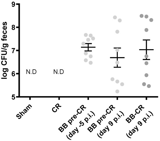 Before infection, B. bifidum load in feces of the BB pre-CR mice after day 2 of administration was 7.2 ± 0.13 log cell/g and there was no significant difference in B. bifidum load before (−5 p.i.) and after infection (9 p.i.) in this group. On day 9 p.i, there was also no significant difference in B. bifidum load between the two probiotic-treated groups (BB-CR: 7.0 ± 0.4, BB pre-CR: 6.7 ± 0.4 log cell/g) (Figure 2). B. bifidum was not detected in CR and Sham mice, which did not receive B. bifidum treatment.