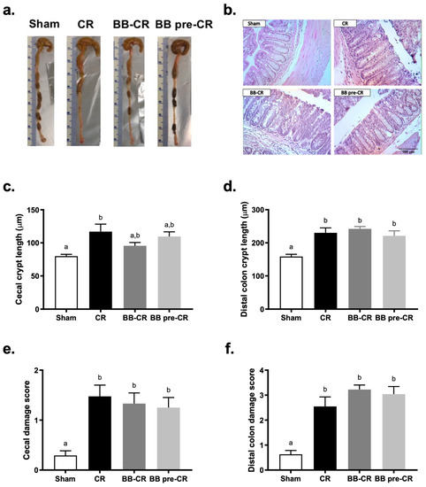 The effect of BB75 on intestinal crypt hyperplasia and tissue damage at day 10 p.i. (a) colon morphology; (b) representative H&E stained histology of distal colon tissues on day 10 p.i.; (c) ceacal (n = 7–8/group) and (d) distal colon crypt lengths (n = 10/group); (e) ceacal and (f) distal colon damage score (n = 10/group) were accessed on a scale of 0–4 (0, no signs of inflammation; 1, minimal evidence of inflammatory cell infiltration; 2, significant evidence of inflammatory cell infiltration; 3, significant evidence of inflammation with goblet cell depletion; 4, sever inflammation characterized by widespread inflammatory cells infiltration, goblet cell depletion and destruction of the mucosal architecture). Results are expressed as mean ± SE. Statistical significance was determined by one-way ANOVA, followed by the Bonferroni’s post-hoc test. Different superscripts (a,b) indicate statistical significance between groups, p < 0.05.